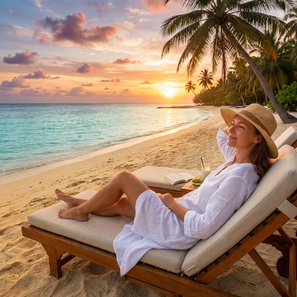 황금빛 노을이 물드는 열대 해변에서 하얀 린넨 드레스를 입고 선베드에 누워 칵테일을 즐기며 파도 소리를 들으며 여유로운 휴식을 취하는 여성의 평화로운 순간