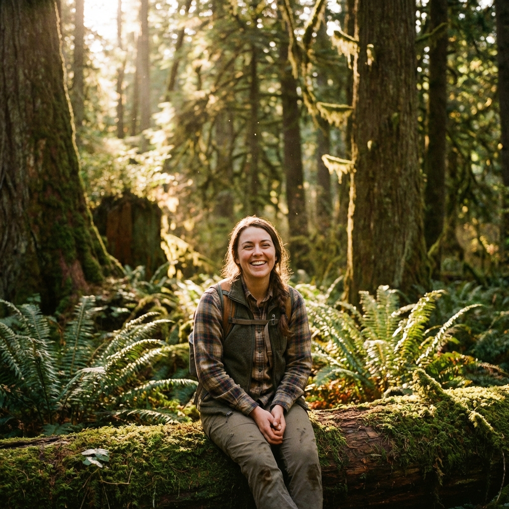 이끼 낀 고목들 사이로 쏟아지는 신비로운 햇살 아래, 체크무늬 플란넬 셔츠를 입고 자연의 품에서 진심 어린 미소를 짓는 여성의 따뜻한 순간 포착