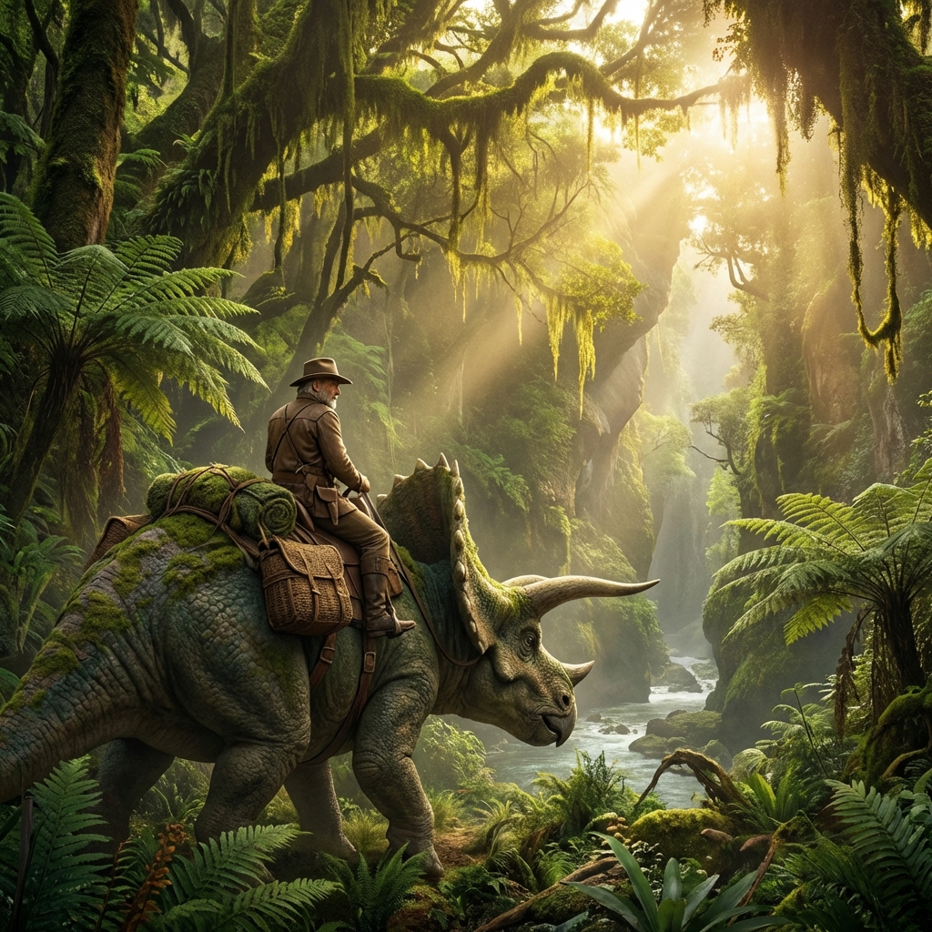울창한 선사시대 정글을 배경으로 거대한 트리케라톱스 등에 올라타 미지의 세계를 탐험하는 용감한 모험가의 영화 같은 판타지 장면
