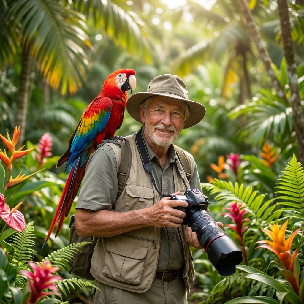 열대 정글의 화려한 꽃들 사이에서 빨간 마코앵무새를 어깨에 올리고 전문 카메라로 자연을 촬영하는 야생 동물 사진작가의 생동감 넘치는 장면