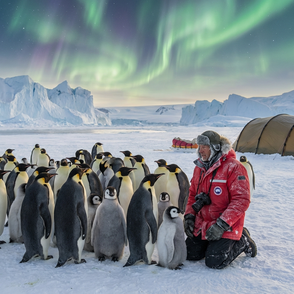 오로라가 하늘을 수놓는 남극 빙원에서 수십 마리의 황제펭귄 무리와 함께 무릎을 꿇고 교감하는 붉은 파카를 입은 탐험가의 감동적인 장면